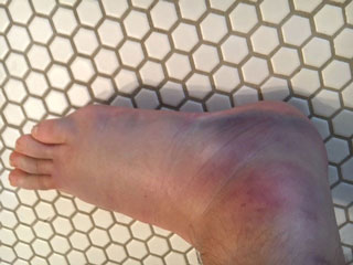 This shows a sprained ankle. The ankle and foot are swollen because they were not wrapped with an elastic bandage right after the injury.