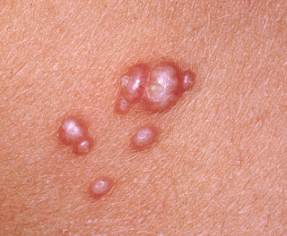 This shows an infection from the molluscum contagiosum virus. Molluscum is sometimes called a "water wart." The growths are pink, white or pearly-colored. They are firm, small and raised with a dimple in the middle.