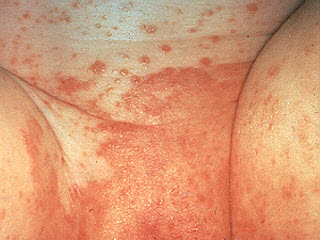 Any diaper rash that lasts longer than a couple days can become infected with yeast. Note the red spots outside the main area of redness.