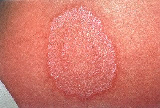 This is a picture of ringworm. The area is round and pink. It has a raised, rough scaly border. The ring slowly grows in size. It is often slightly itchy.