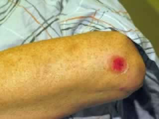 This scrape (abrasion) near the elbow occurred 3 days ago. The picture shows a scrape that is starting to crust over.
