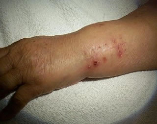 This photo shows a scalp laceration after it has been closed with 4 metal medical staples.