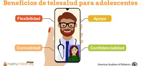 ¿Es hora del chequeo médico de su hijo adolescente? Su pediatra puede ofrecer visitas de telesalud a través de videollamadas y otras opciones remotas que pueden ahorrarle un viaje al consultorio. Muchos adolescentes y adultos jóvenes prefieren las visitas de telesalud a las visitas al consultorio. Pueden visitar al médico que conocen y en quien confían usando un teléfono o una computadora portátil.