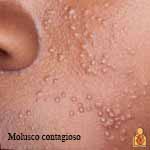 El molusco contagioso es una infección viral que causa protuberancias nacaradas en la piel del pecho, la espalda, los brazos o las piernas de un niño. Las protuberancias en forma de cúpula, también conocidas como "verrugas de agua", pueden tener un hoyuelo en el centro. El poxvirus que causa las protuberancias es más común en climas cálidos y húmedos.