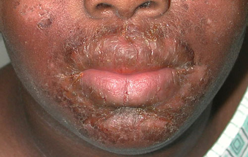 • Impétigo con costras: este es el tipo más común de impétigo y comienza como pequeñas ampollas (pequeñas burbujas llenas de líquido) que revientan y dejan manchas rojas que supuran y que al secarse se convierten en costras amarillas o de color miel.
