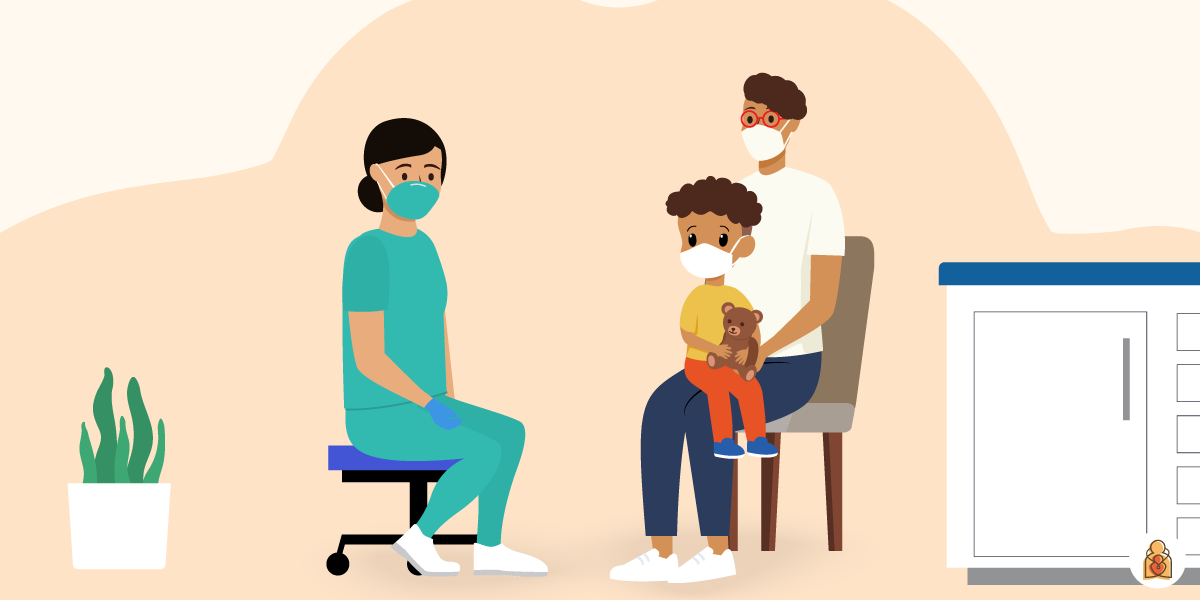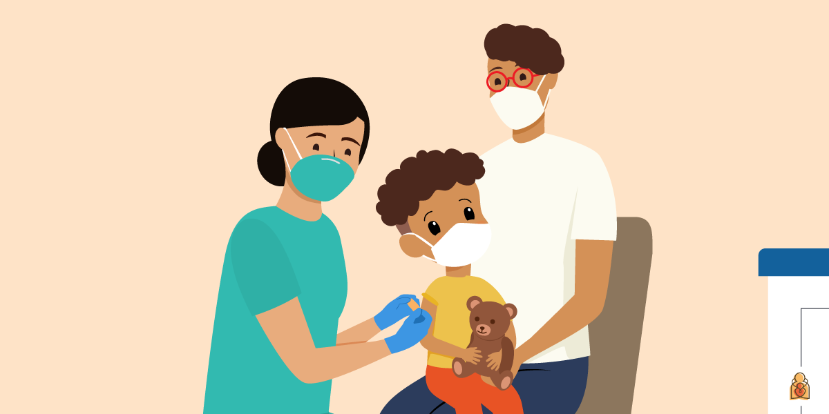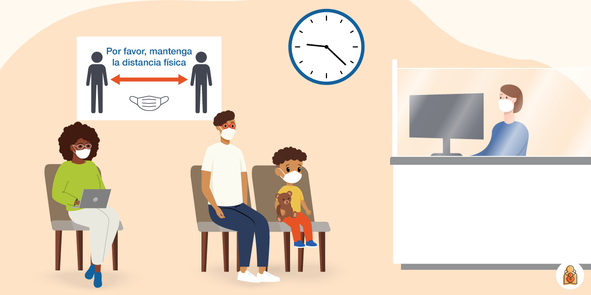 Voy al lugar donde me ponen la vacuna (consultorio médico, escuela, clínica, farmacia) con un adulto en quien confío. Llevo una mascarilla. Las otras personas en donde ponen las vacunas también usan mascarillas.