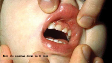 Desde el momento que el niño está expuesto a la enfermedad de mano, pie y boca, toma de 3 a 6 días para que aparezca el primer síntoma. A esto se le llama el periodo de incubación. Por lo general empieza con fiebre, dolor de garganta y goteo nasal, como es el caso del resfriado común, pero luego un sarpullido y ampollas pequeñas empiezan a aparecer en las siguientes partes del cuerpo: