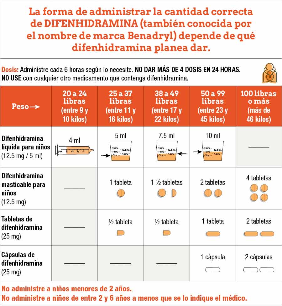 La siguiente tabla* puede ayudarle a determinar la cantidad correcta de difenhidramina que debe administrar. (Encuentre una versión para imprimir aquí). Use el peso de su hijo para decidir la cantidad correcta. Puede encontrar el peso en la fila superior de la tabla.